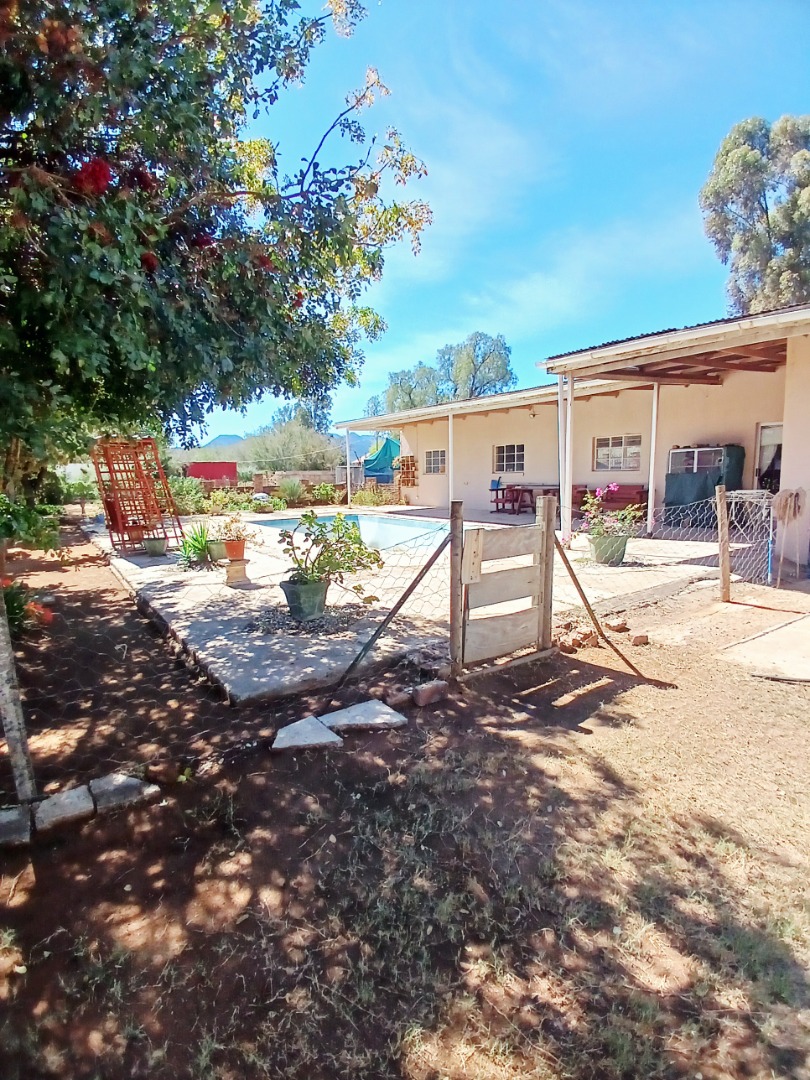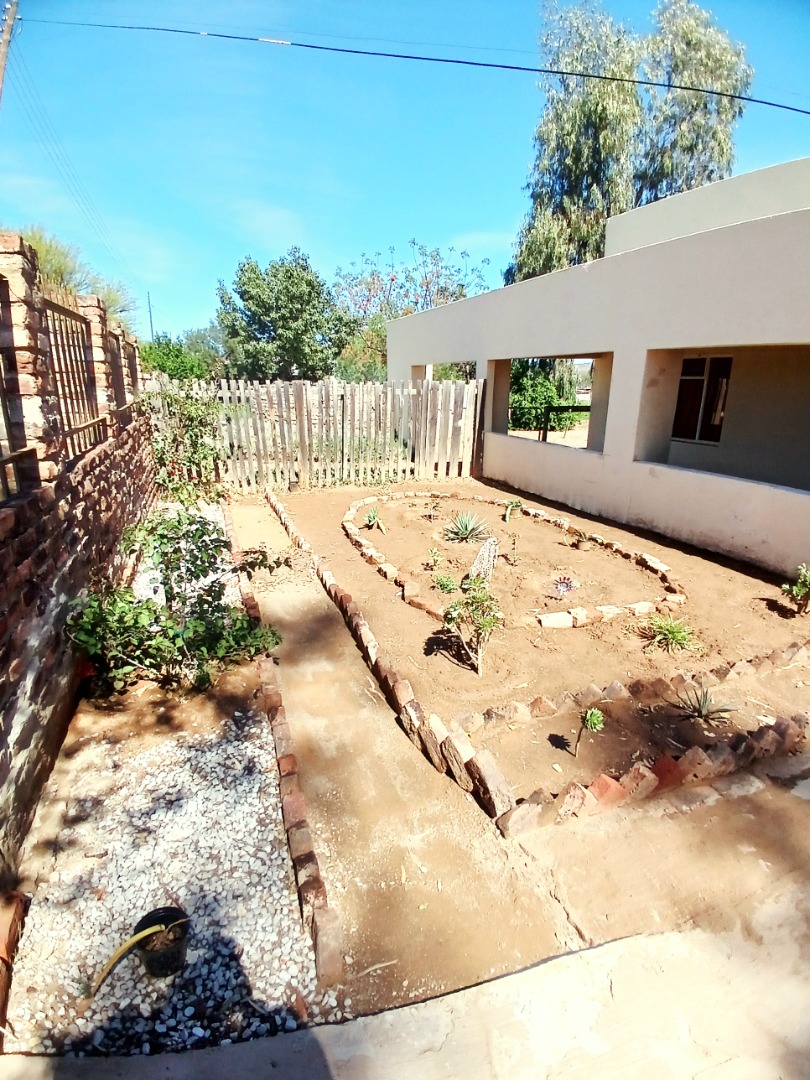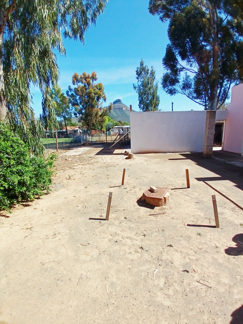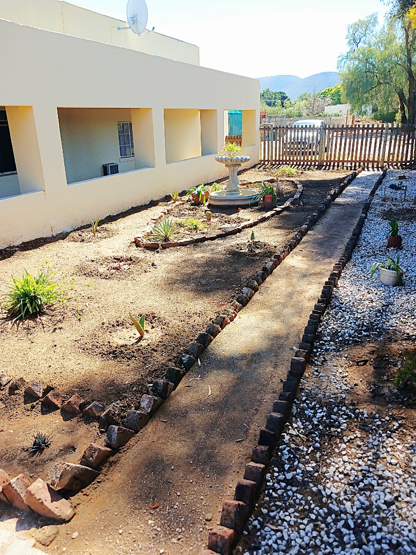 Discover a property offering significant potential in the tranquil setting of Adendorp, Graaff-Reinet. This single-story residence, set on a generous 1838 sqm erf, presents a unique opportunity for those seeking country living with scenic mountain views. The exterior features a light-colored building, a garden space with a fountain, and newly planted vegetation, providing a welcoming first impression.