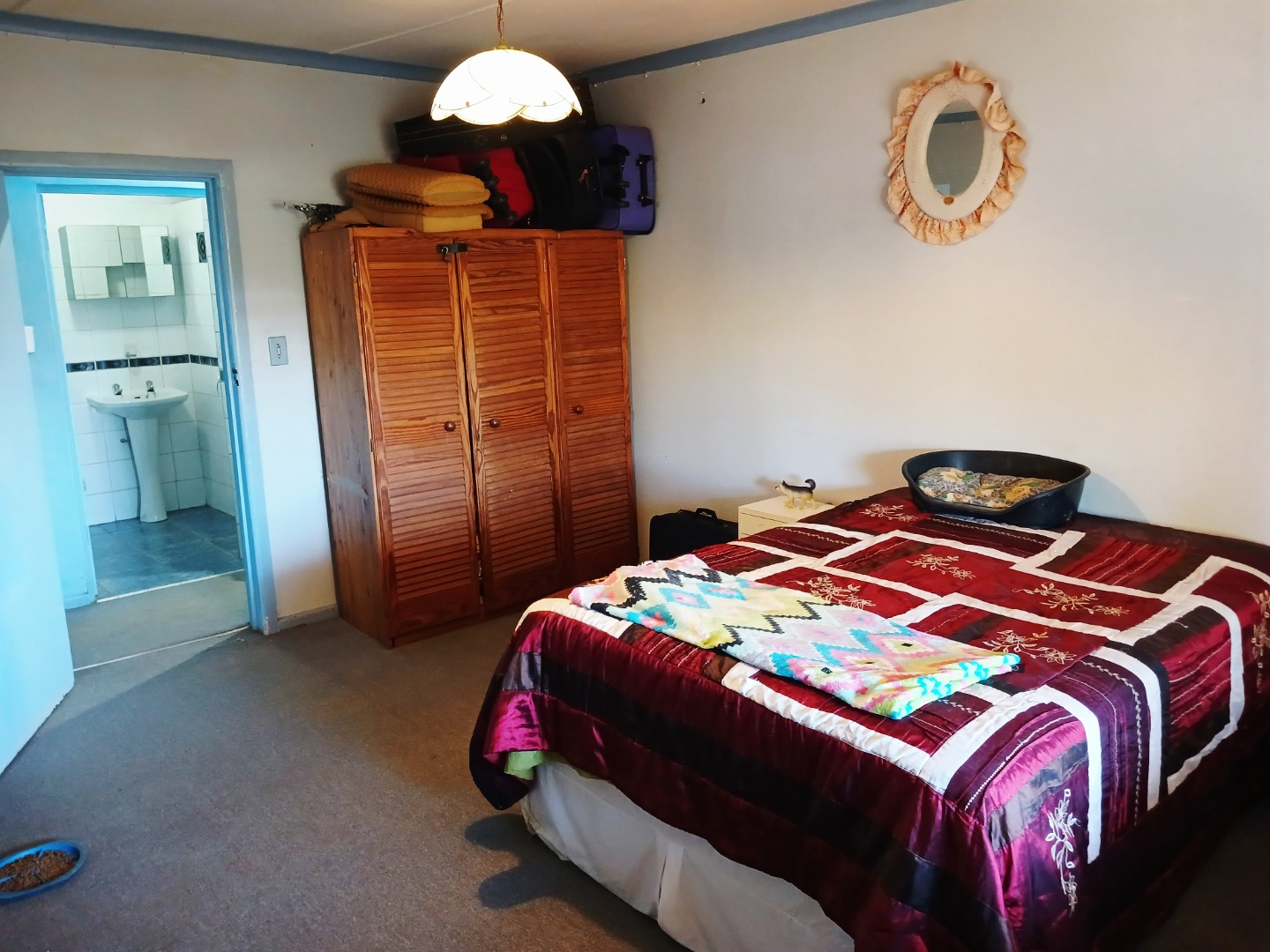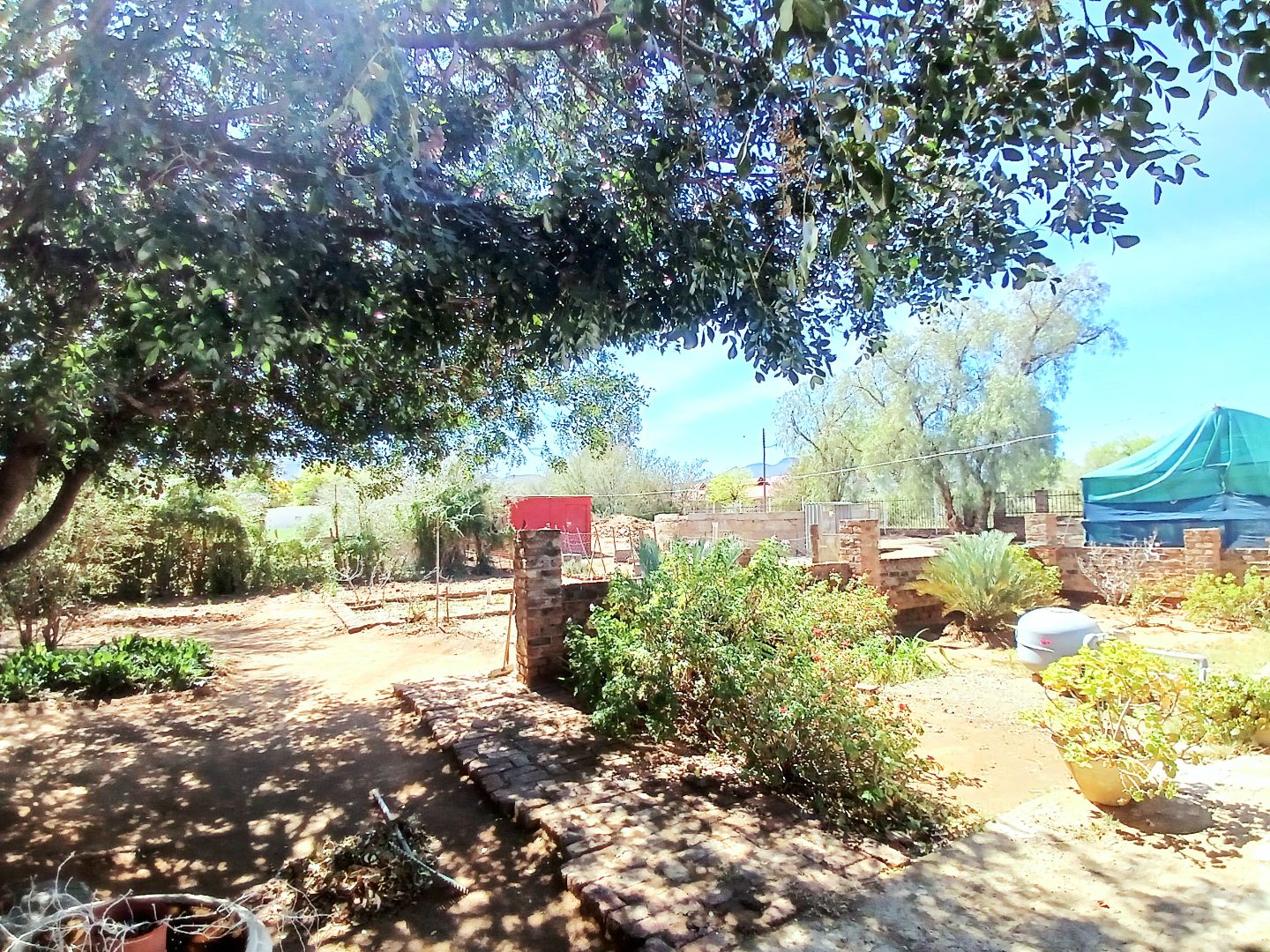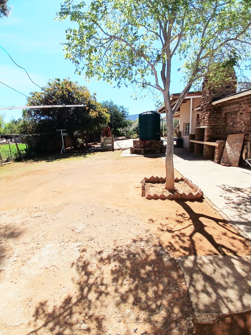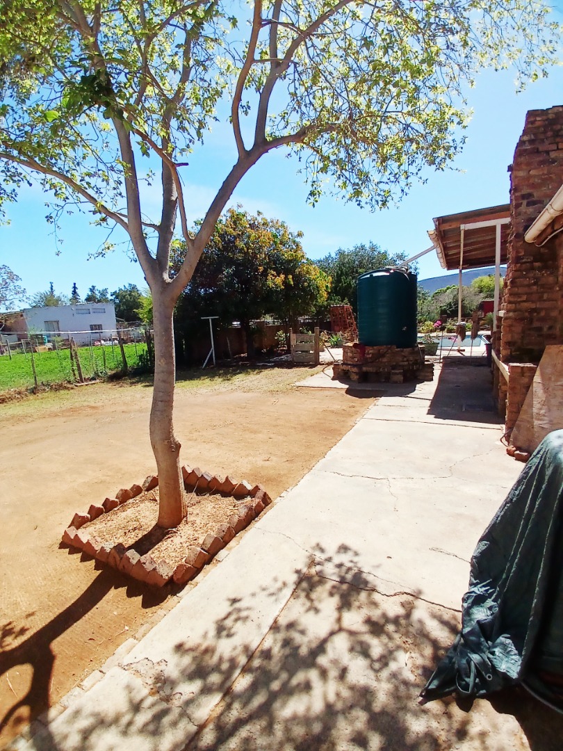 Discover a property offering significant potential in the tranquil setting of Adendorp, Graaff-Reinet. This single-story residence, set on a generous 1838 sqm erf, presents a unique opportunity for those seeking country living with scenic mountain views. The exterior features a light-colored building, a garden space with a fountain, and newly planted vegetation, providing a welcoming first impression.