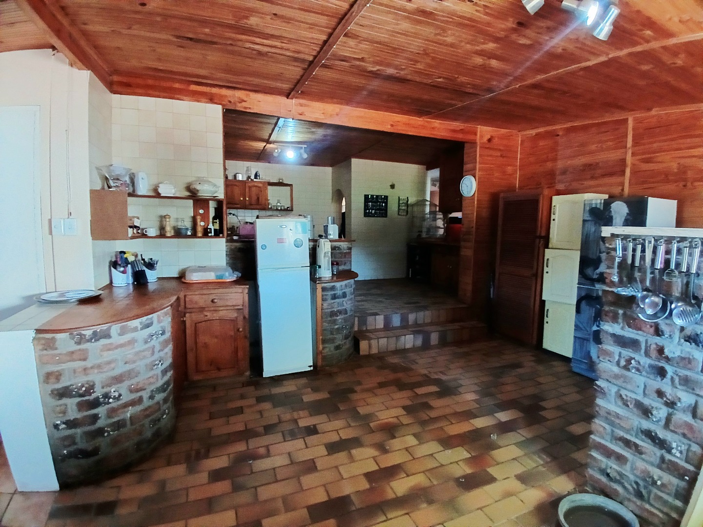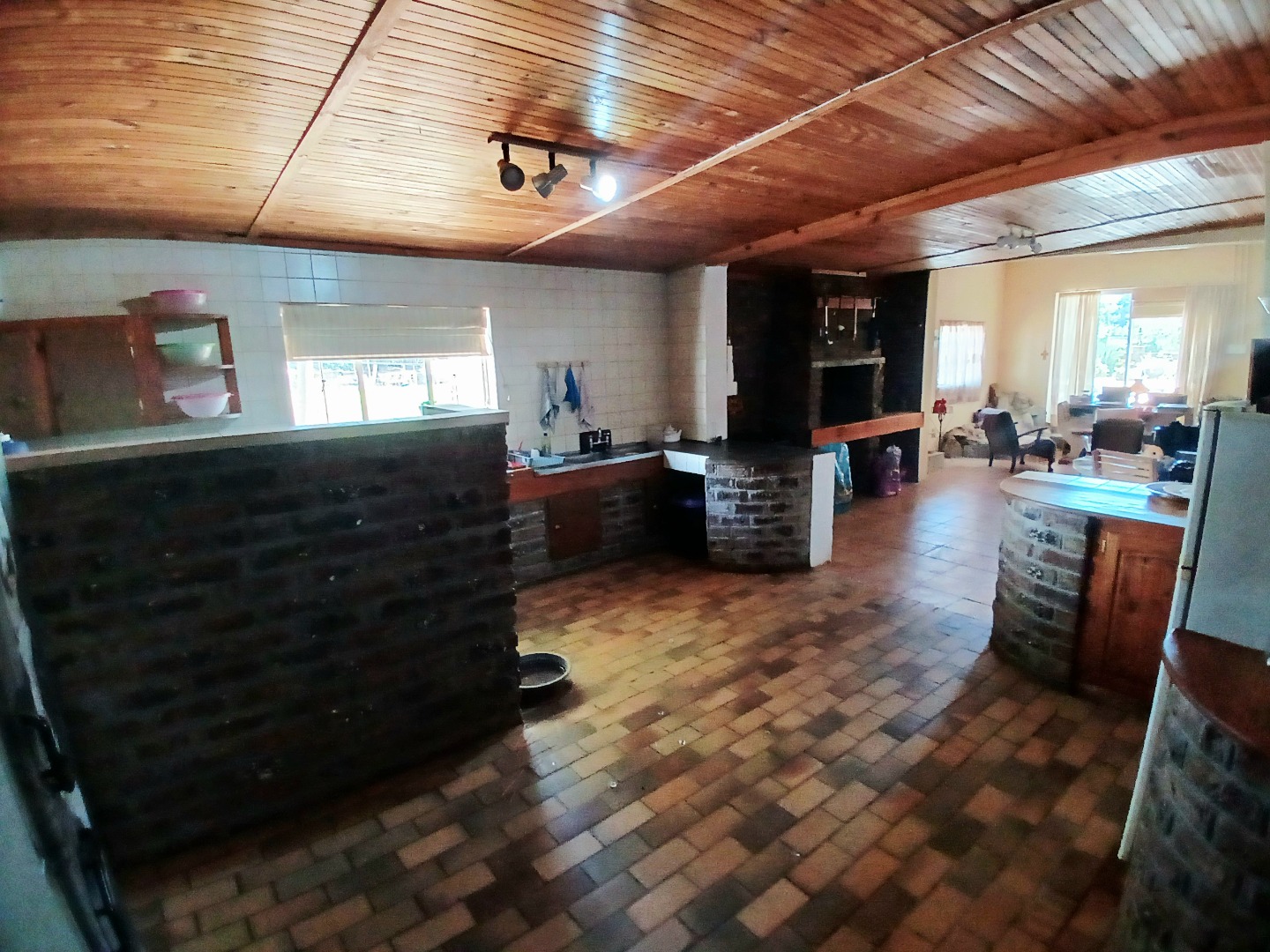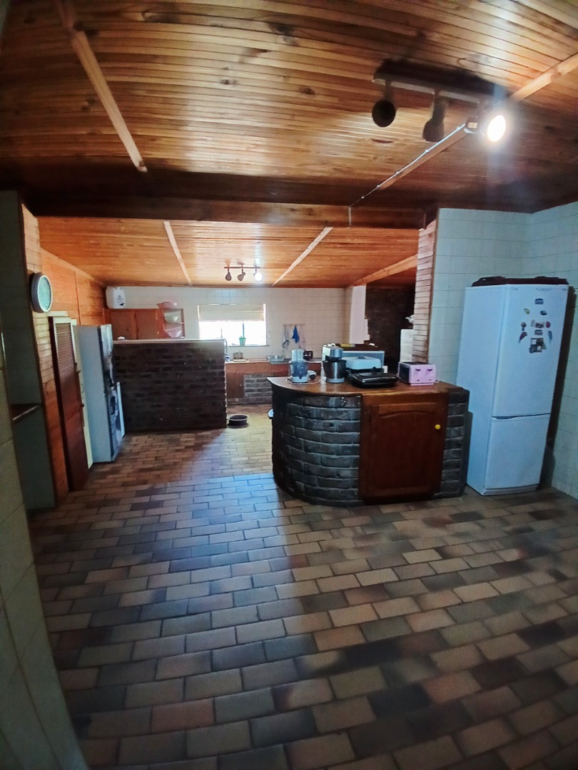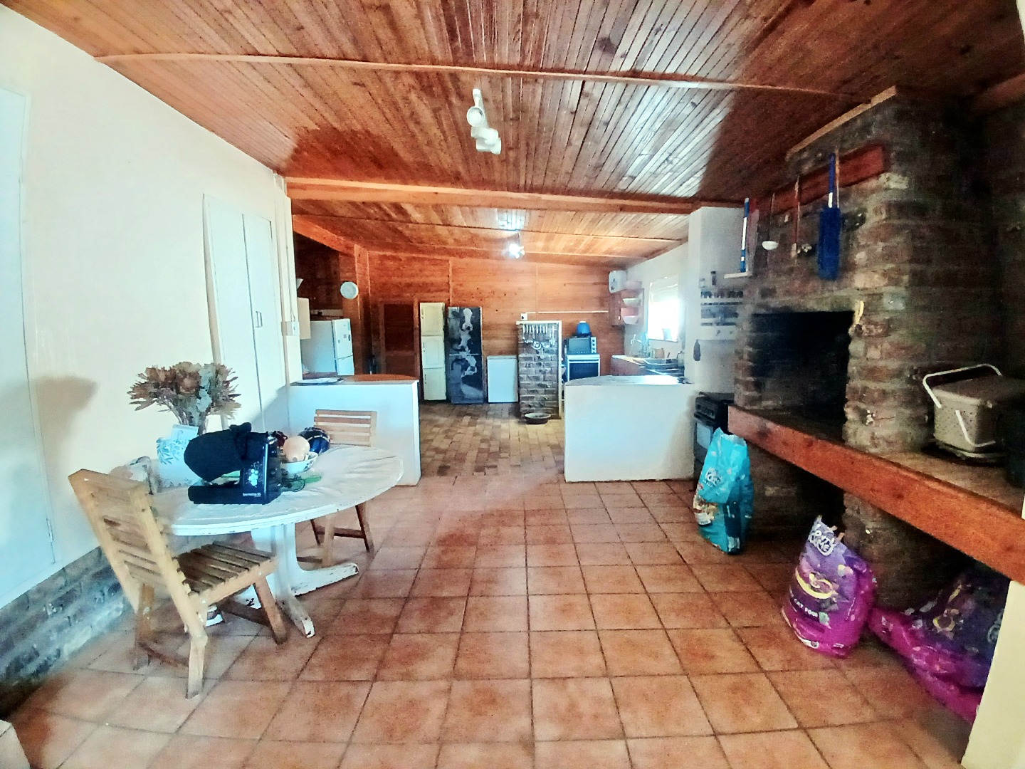 The interior boasts two spacious lounges and a dedicated dining room, offering ample space for relaxation and entertaining. The open-plan living and kitchen areas feature durable tiled flooring and a rustic aesthetic, including a wooden slatted ceiling and a large brick braai/fireplace, perfect for South African gatherings. While some elements present a dated charm, they also provide a canvas for modern updates and personal customisation.