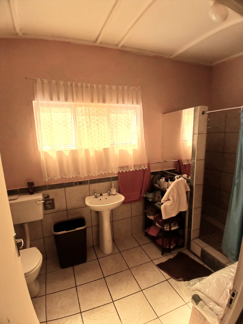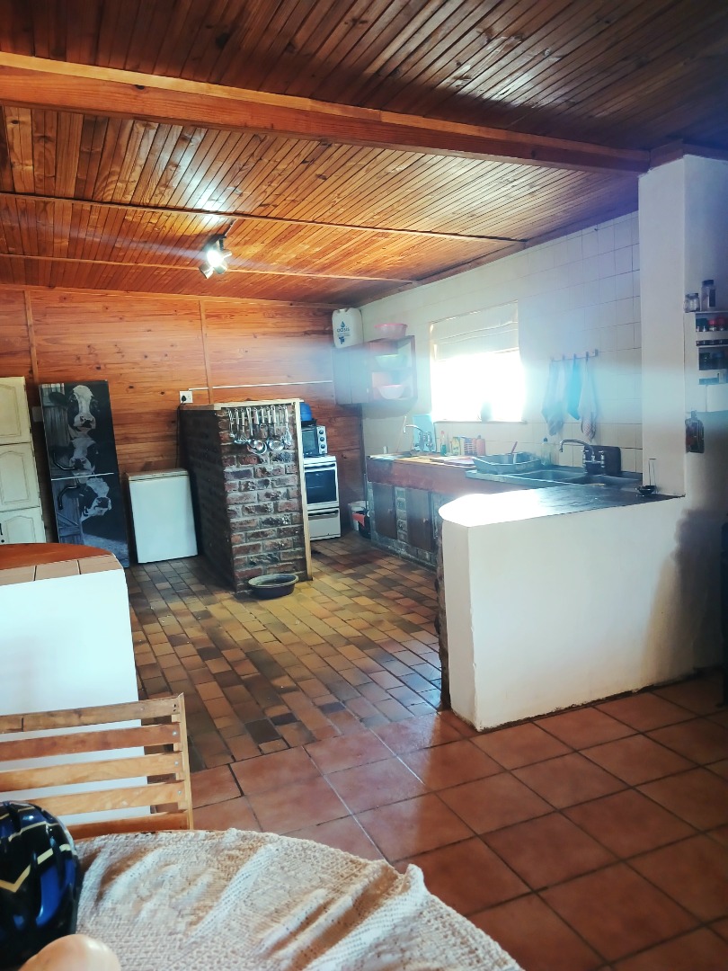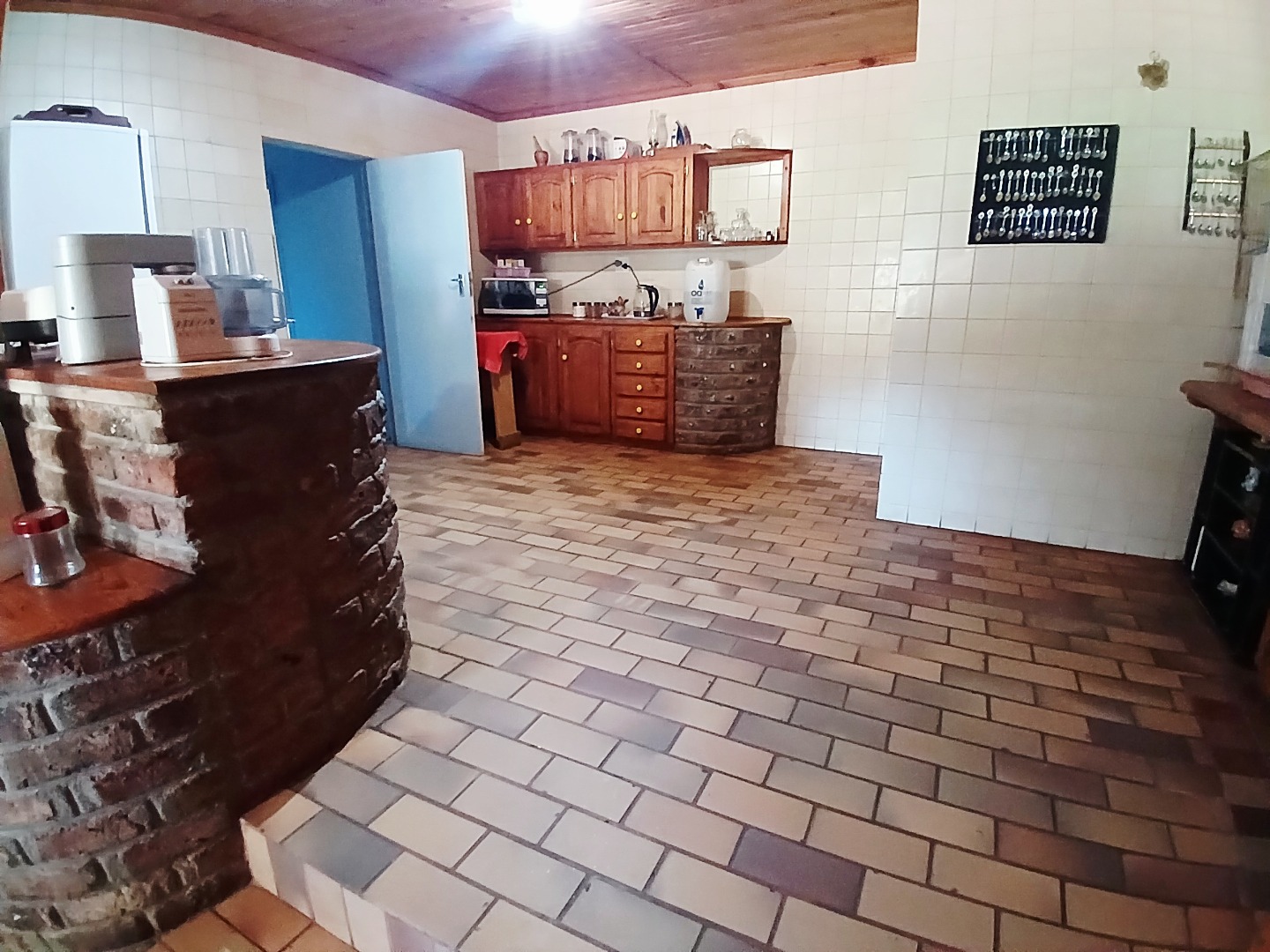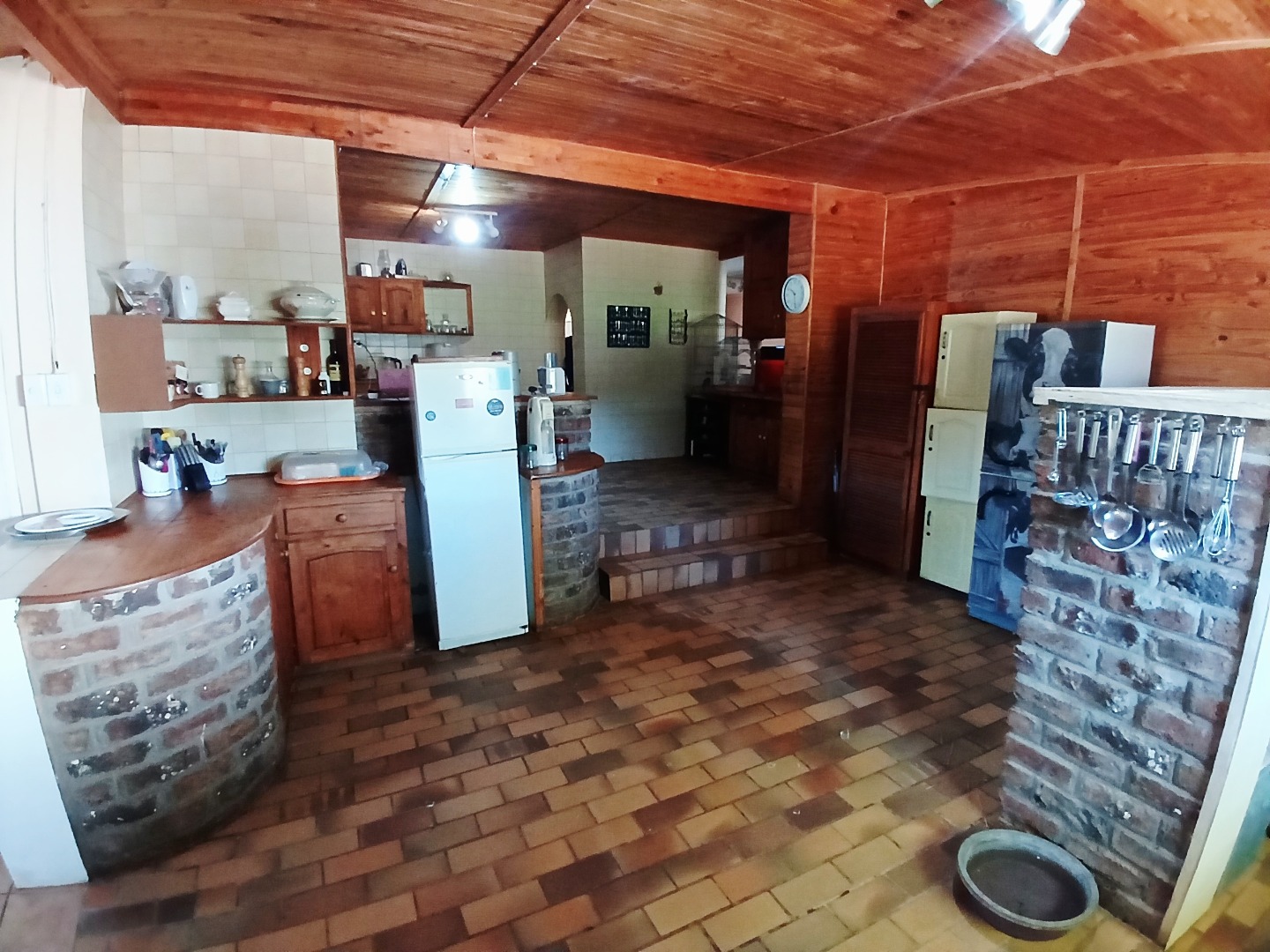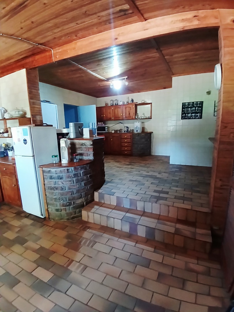 The interior boasts two spacious lounges and a dedicated dining room, offering ample space for relaxation and entertaining. The open-plan living and kitchen areas feature durable tiled flooring and a rustic aesthetic, including a wooden slatted ceiling and a large brick braai/fireplace, perfect for South African gatherings. While some elements present a dated charm, they also provide a canvas for modern updates and personal customisation.