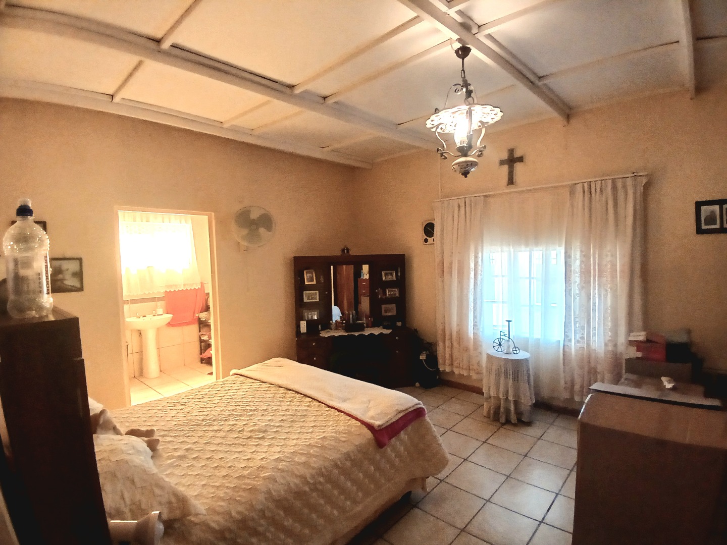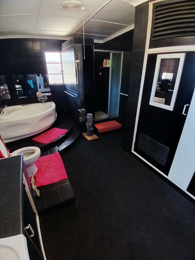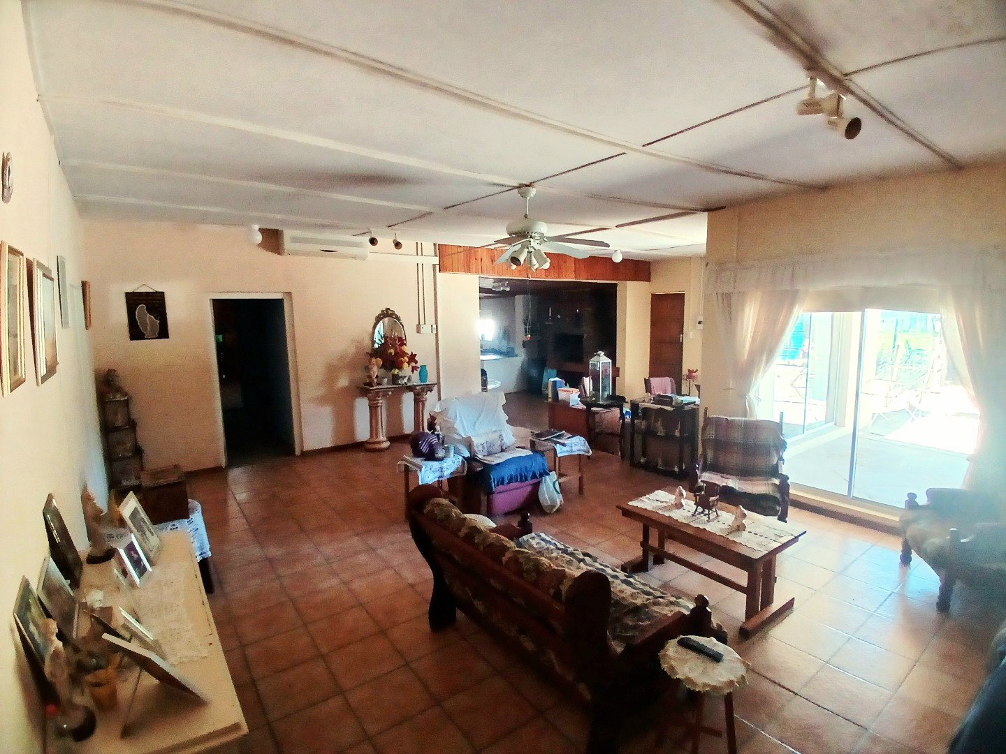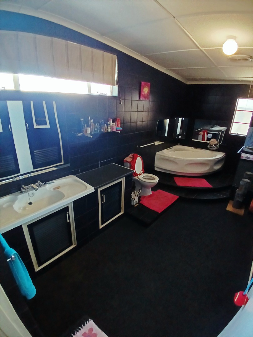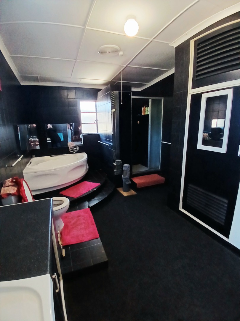 The interior boasts two spacious lounges and a dedicated dining room, offering ample space for relaxation and entertaining. The open-plan living and kitchen areas feature durable tiled flooring and a rustic aesthetic, including a wooden slatted ceiling and a large brick braai/fireplace, perfect for South African gatherings. While some elements present a dated charm, they also provide a canvas for modern updates and personal customisation.