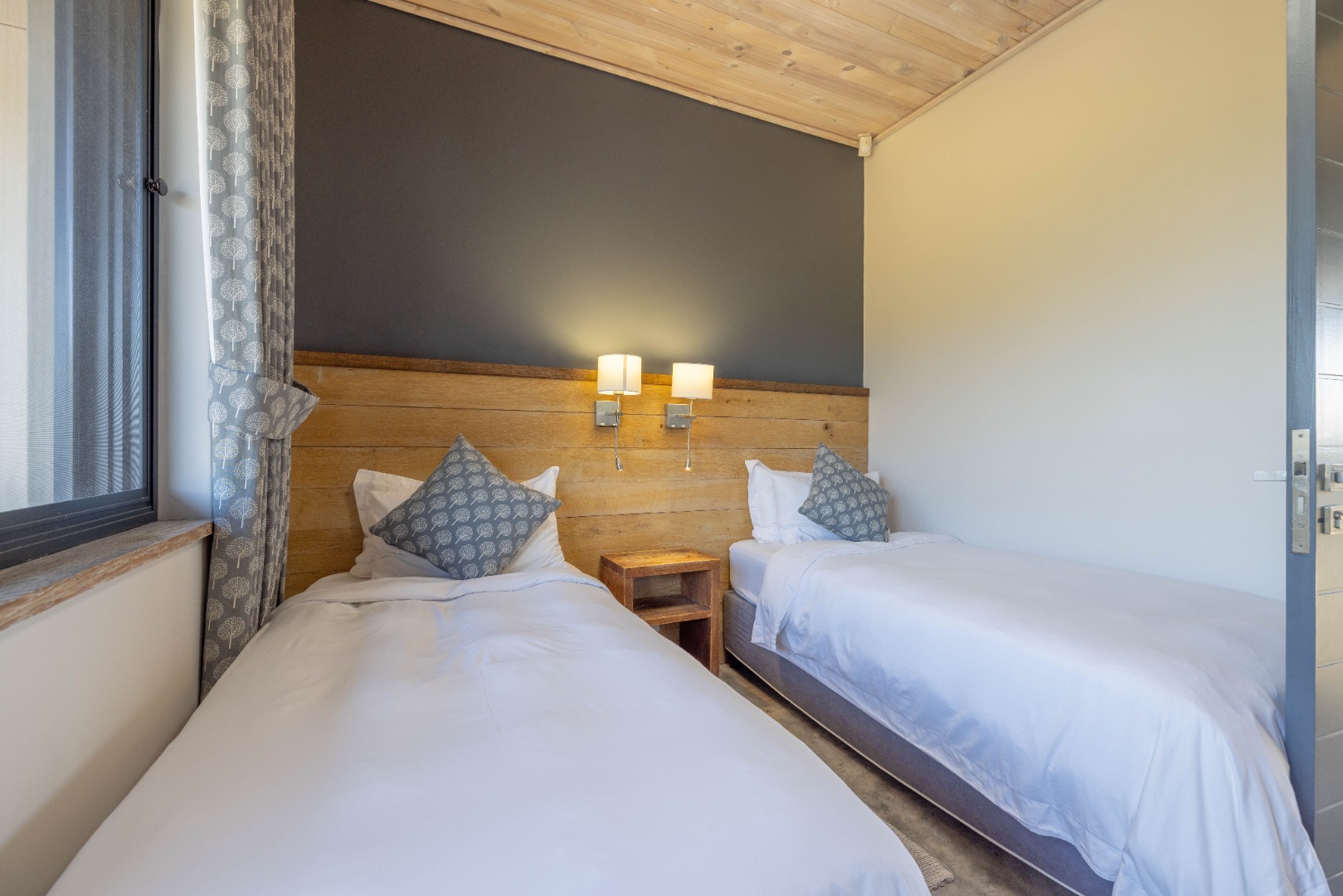 The main bedroom includes an elegant oak work desk with serene views across the estate, while the two upstairs bedrooms open onto north-facing balconies overlooking the pool.