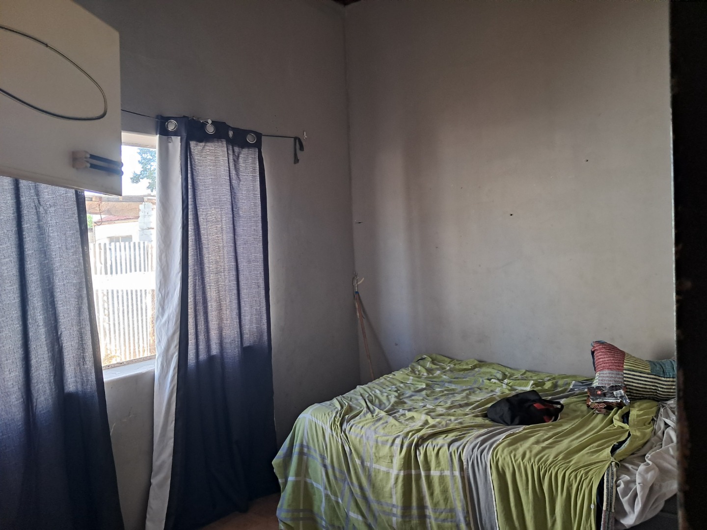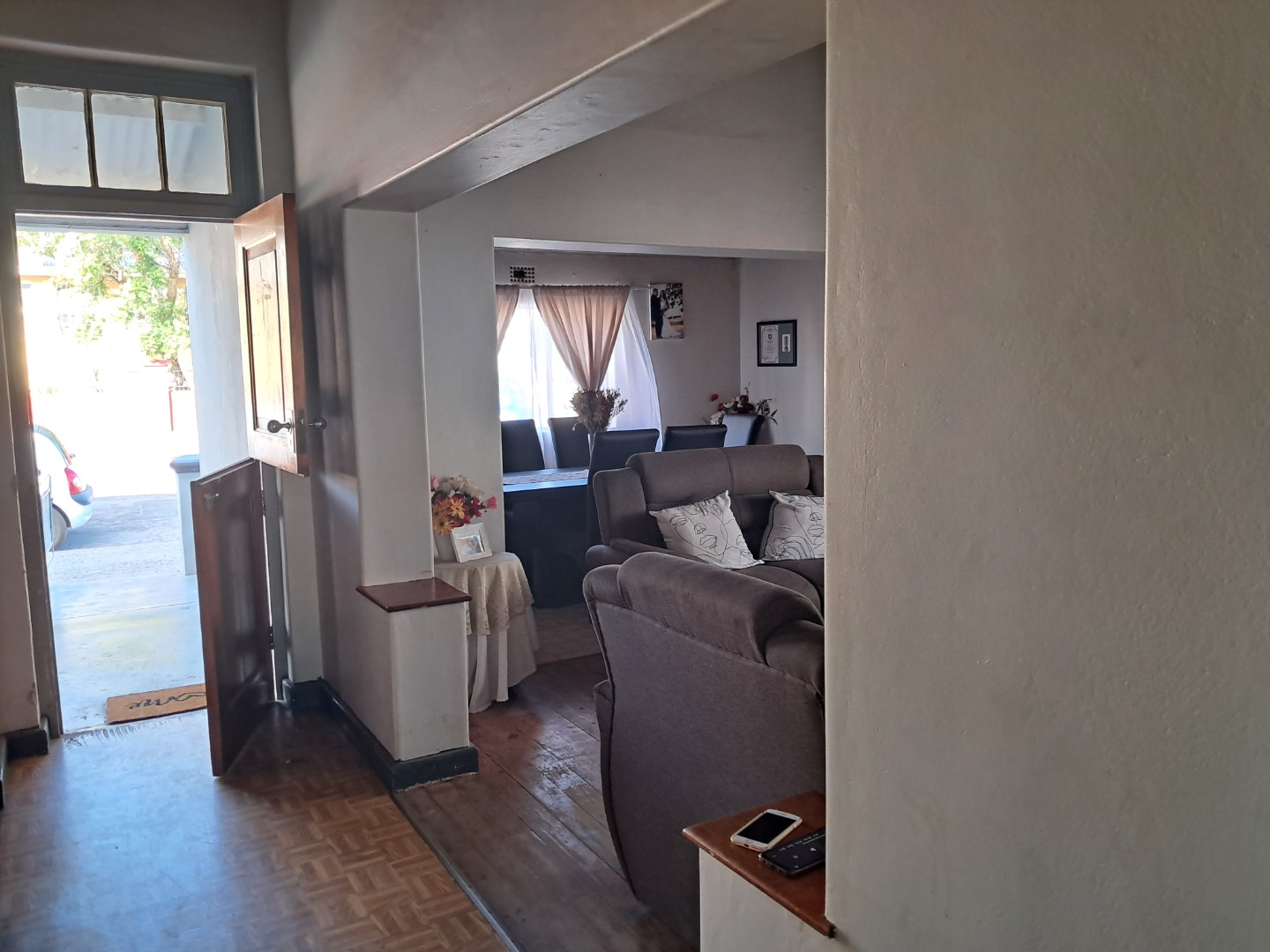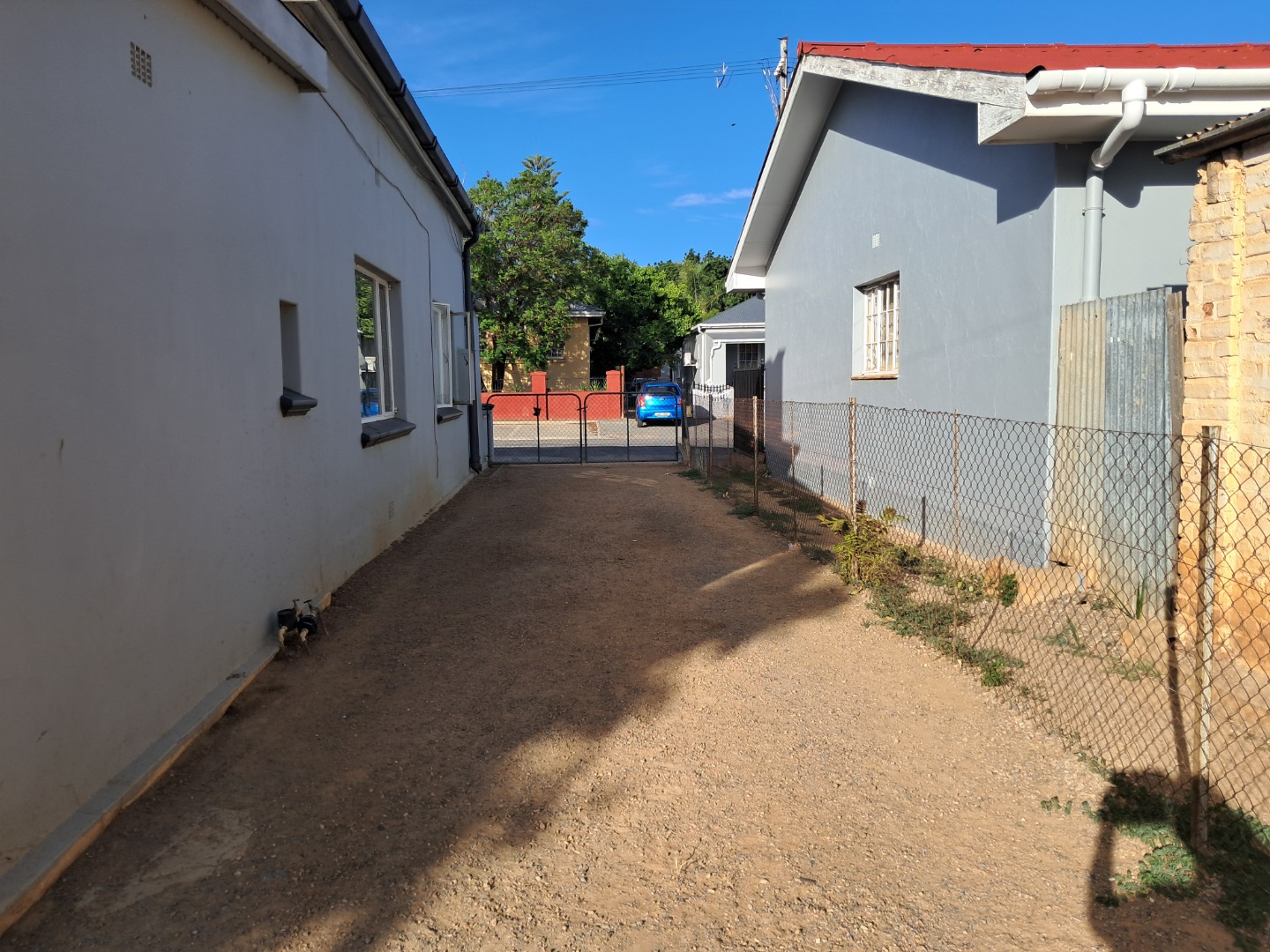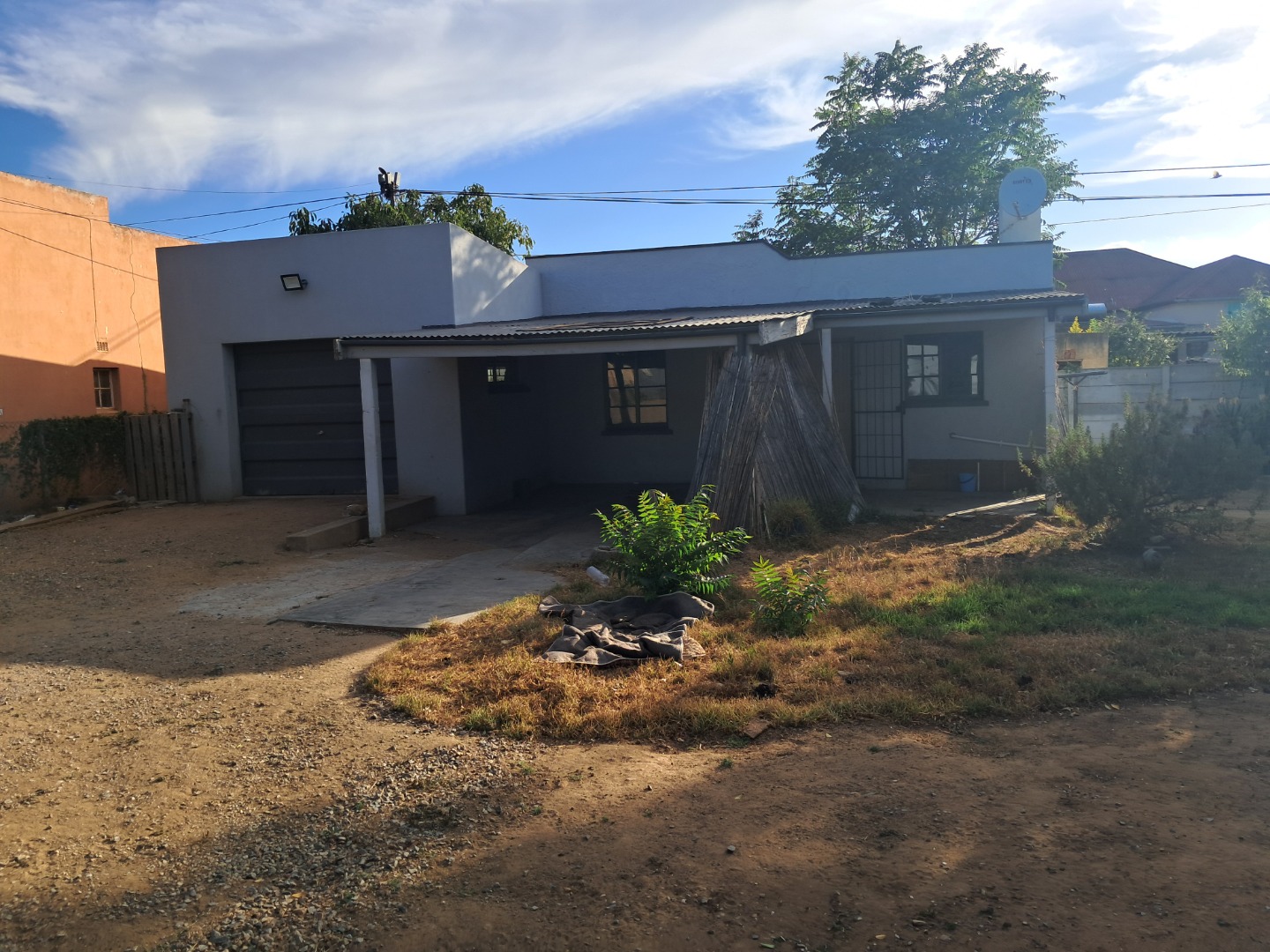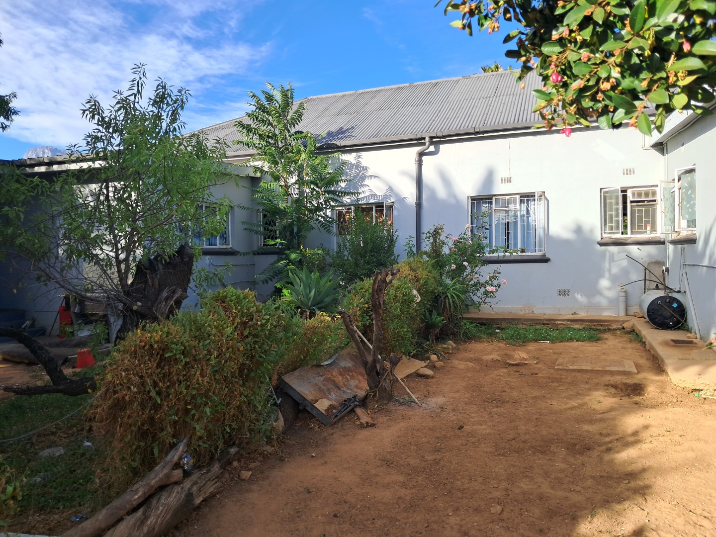 Exterior features include secure gated access and off-street parking for four vehicles, complemented by a single garage. Security bars on windows and secure fencing offer peace of mind. The property's frontage, though currently featuring minimal landscaping and an unpaved road, offers scope for enhancing curb appeal. The corrugated iron roof and some window frames show signs of age, indicating areas for future maintenance and improvement.
