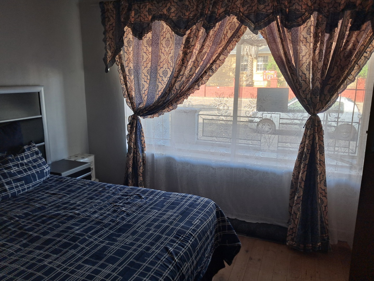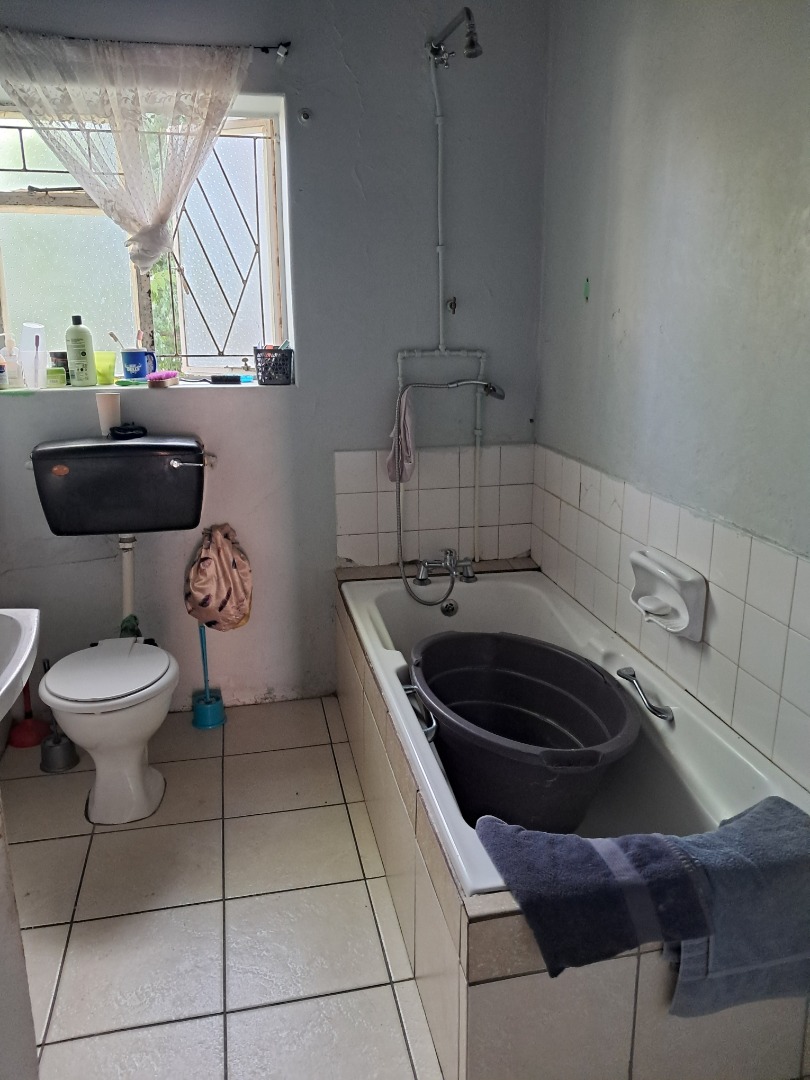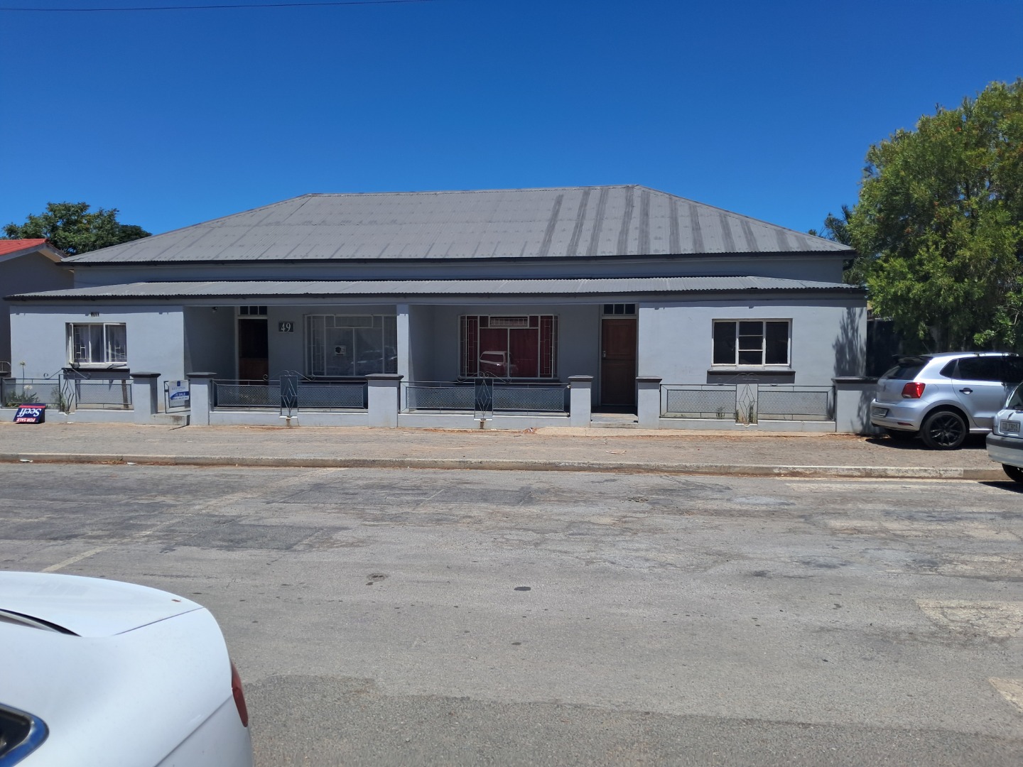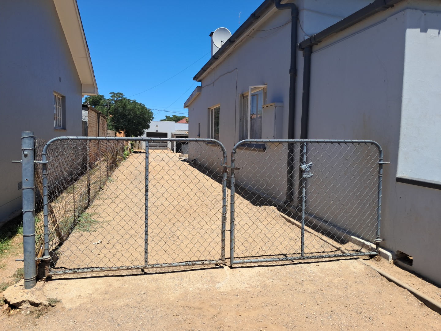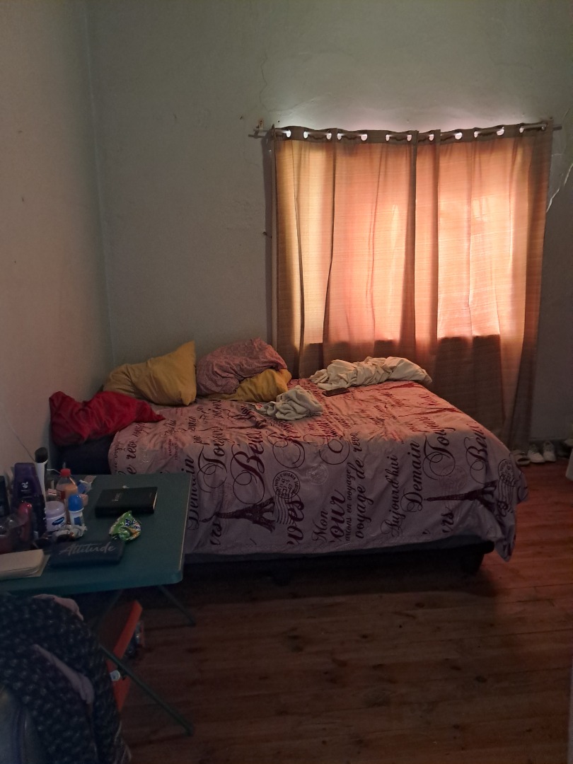 Exterior features include secure gated access and off-street parking for four vehicles, complemented by a single garage. Security bars on windows and secure fencing offer peace of mind. The property's frontage, though currently featuring minimal landscaping and an unpaved road, offers scope for enhancing curb appeal. The corrugated iron roof and some window frames show signs of age, indicating areas for future maintenance and improvement.