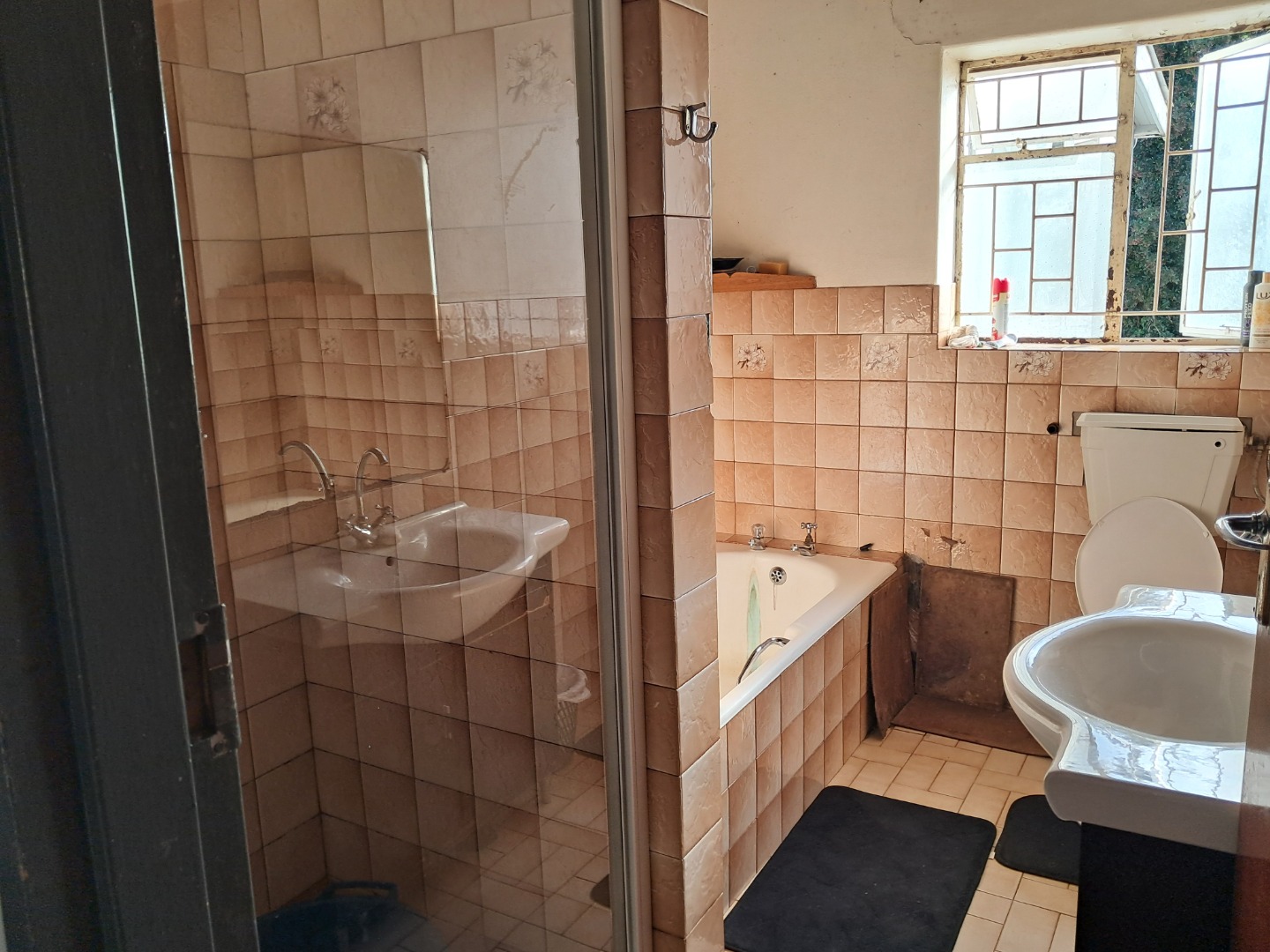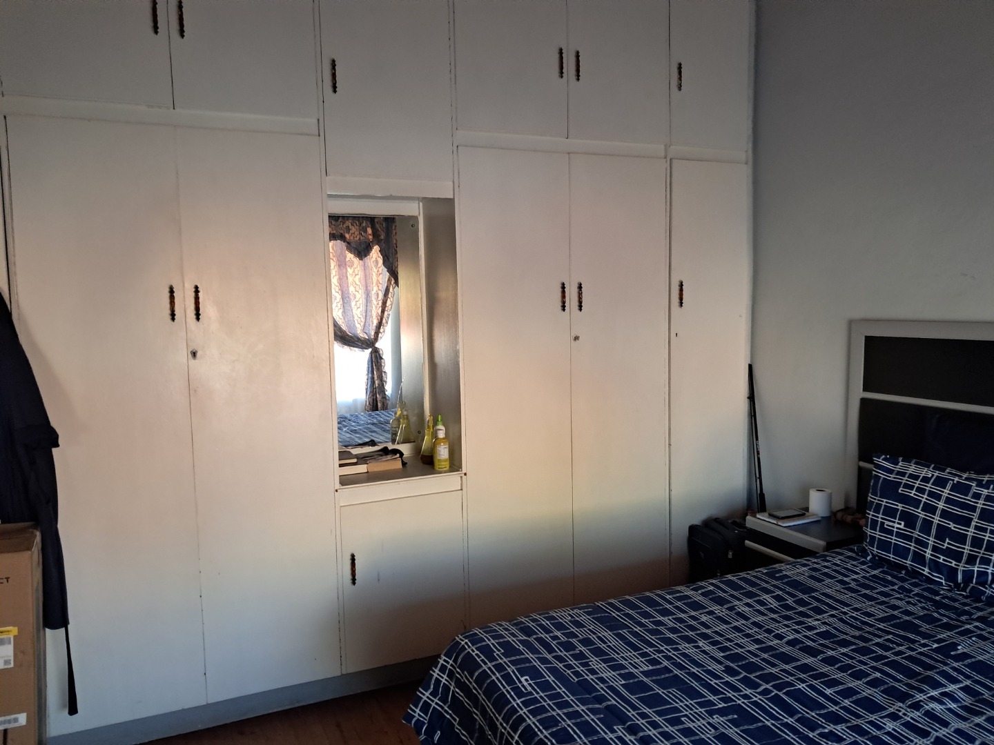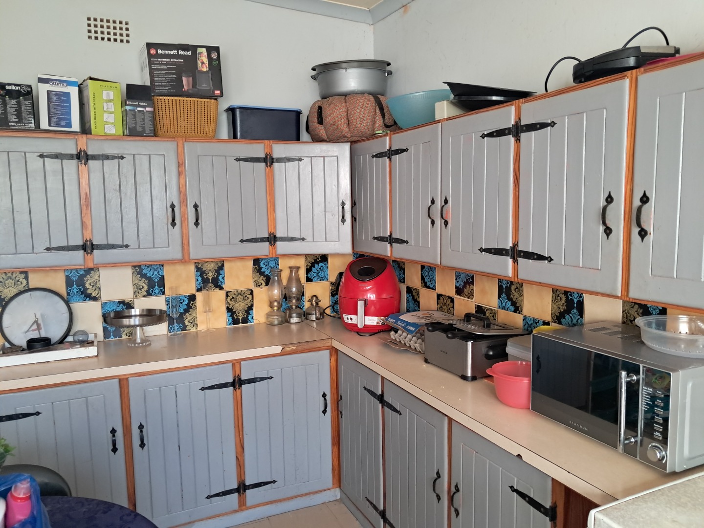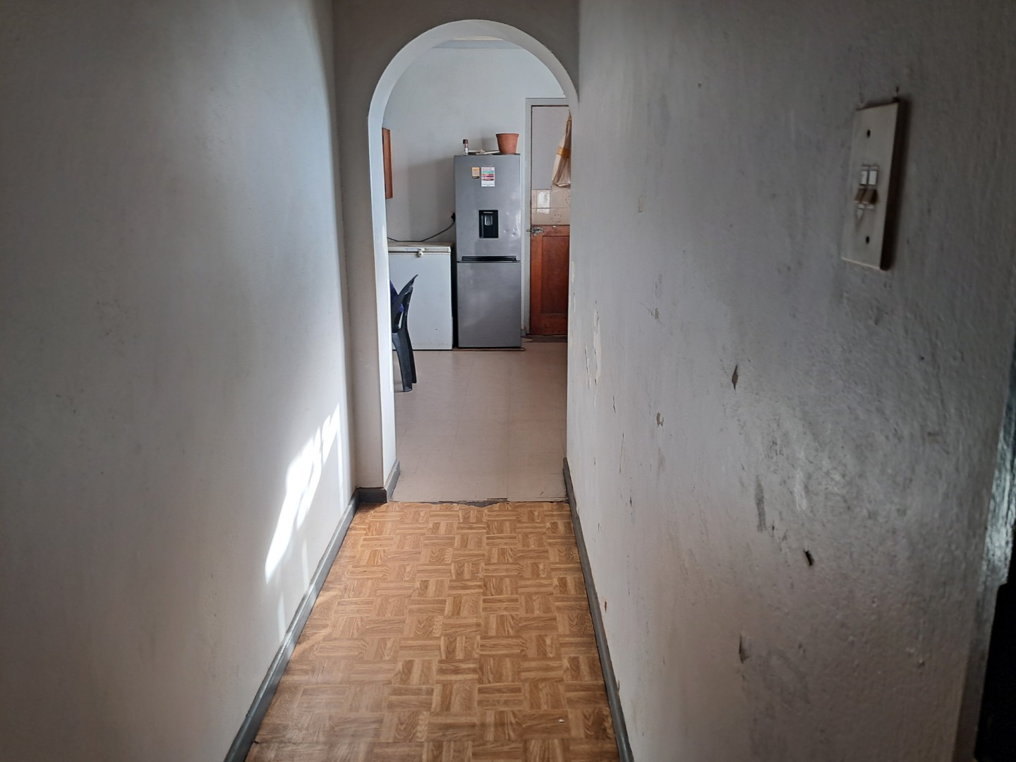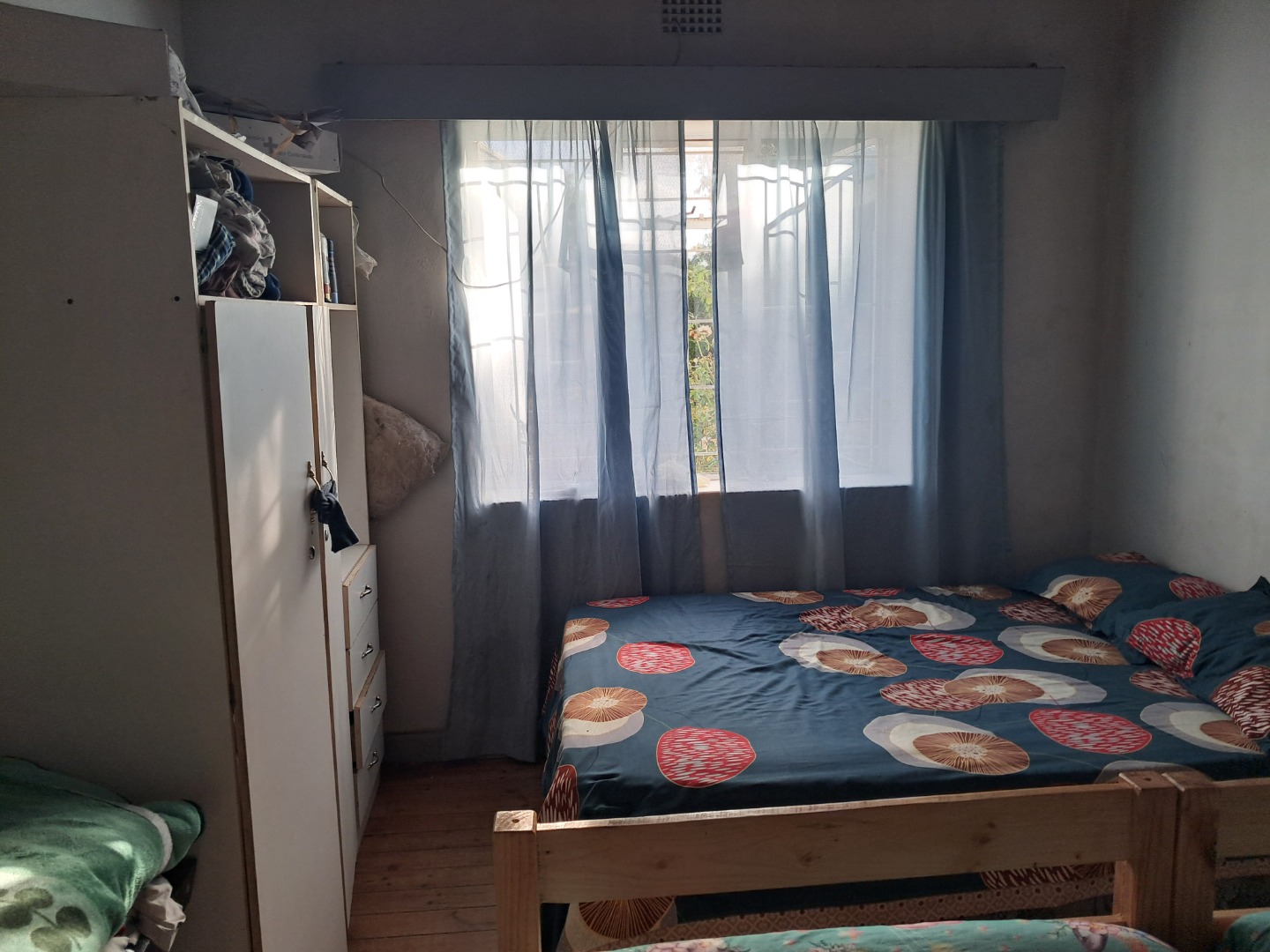 Exterior features include secure gated access and off-street parking for four vehicles, complemented by a single garage. Security bars on windows and secure fencing offer peace of mind. The property's frontage, though currently featuring minimal landscaping and an unpaved road, offers scope for enhancing curb appeal. The corrugated iron roof and some window frames show signs of age, indicating areas for future maintenance and improvement.